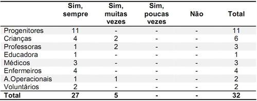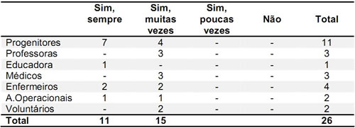 Na perspectiva dos pais e equipa médica e não-médica, as crianças gostam e valorizam a prática da actividade artística, sendo que 16 assinalaram aperceber-se do valor dado pelas crianças "Sim, muitas vezes", e 10 assinalaram "Sim, muitas vezes", como podemos observar na Tabela 5.