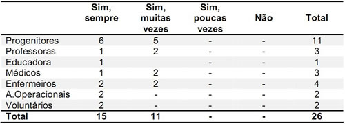 Com respeito ao "estímulo à actividade de ocupação", verificamos que 15 inquiridos assinalaram que "Sim, sempre" incentivam, e os outros 11 indicam que também incentivam "Sim, muitas vezes" (Tabela 4).