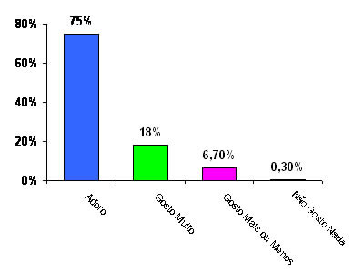 No que diz respeito ao gosto pelo desporto, a grande maioria adora desporto sendo esse valor bastante superior em relação aos que gostam muito, aos que gostam mais ou menos e ao caso esporádico que não gosta nada.