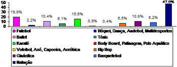 As modalidades identificadas pelos alunos são diversificadas, verificando-se um maior conhecimento da oferta das modalidades de Futebol, Basquetebol, Natação e Karaté, embora outras modalidades como o Andebol, o Tênis, o Hóquei, o Voleibol, o Ballet, a Ginástica, o Hip Hop, a Dança, o Play Gim, Judo, Surf, Aeróbica, Patinagem, Atletismo, Musculação, Capoeira e Pólo Aquático também tenham sido referidas embora com percentagens de identificação moderadas.