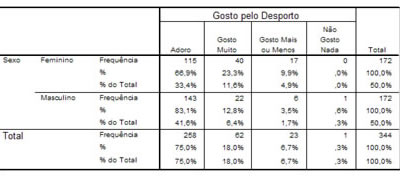 Numa análise por sexo, a tendência da maioria dos alunos, tanto das raparigas como dos rapazes, referiu igualmente que adora ou gosta muito de desporto.