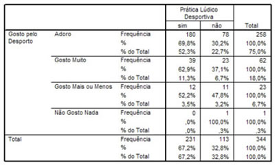 Analisando o gosto pelo desporto em função dos que praticam actividade lúdico-desportiva podemos observar que os que adoram desporto são os que apresentam uma maior percentagem de prática de actividade lúdico-desportiva com 52,3%, sendo que o total dos praticantes são 231 crianças. Seguindo-se os que gostam muito com 11,3% de praticantes (Quadro II).