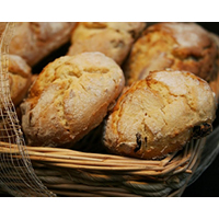 Numa taça colocar a farinha, o açúcar e o sal, adicionar a margarina fria aos cubos pequenos e misturar rapidamente até obter uma massa areada. Juntar as passas, o ovo batido e o iogurte aos poucos (pode não ser necessário todo) até obter uma massa que apesar de ligeiramente mole, pode ser colocada sobre a mesa enfarinhada, polvilha-se também por cima e calca-se de forma a ter mais ou menos 1 cm a 1,5 cm de altura. Corta-se com um corta bolachas, e coloca-se sobre um tabuleiro também ele enfarinhado. Juntam-se as aparas, cortam-se os restantes scones que vão ao forno quente cerca de 10 ou até estarem ligeiramente dourados.