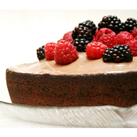 Servir o bolo coberto com o creme de chocolate e as amoras e framboesas.